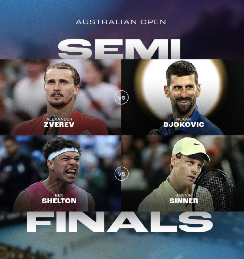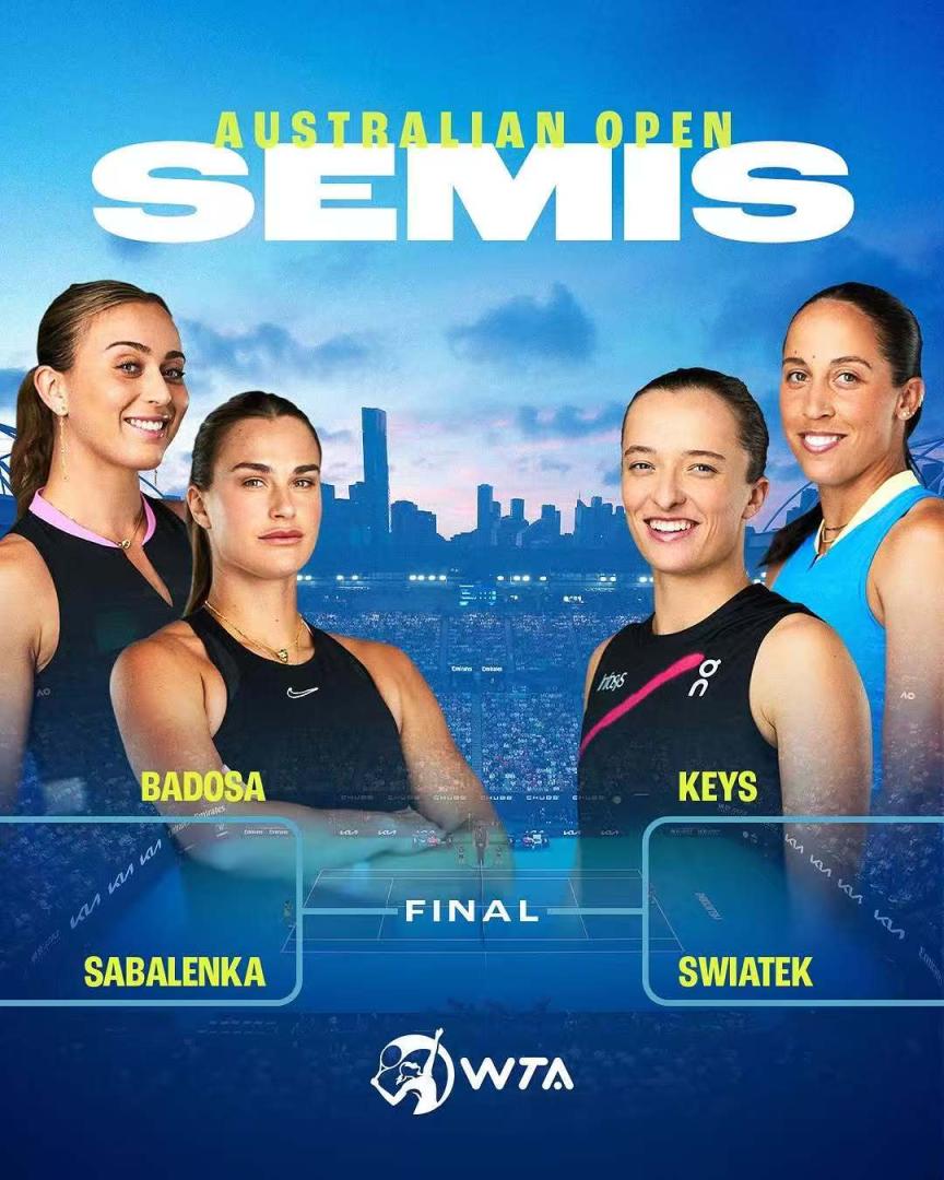 北京时间1月22日,2025澳网结束单打四分之一决赛争夺,男单卫冕冠军辛纳和五届大满贯女单冠军得主斯瓦泰克分别取胜,挺进四强。男单半决赛,辛纳迎战谢尔顿,德约科维奇对阵兹维列夫。女单半决赛对阵为:萨巴伦卡与巴多萨,斯瓦泰克与凯斯。
